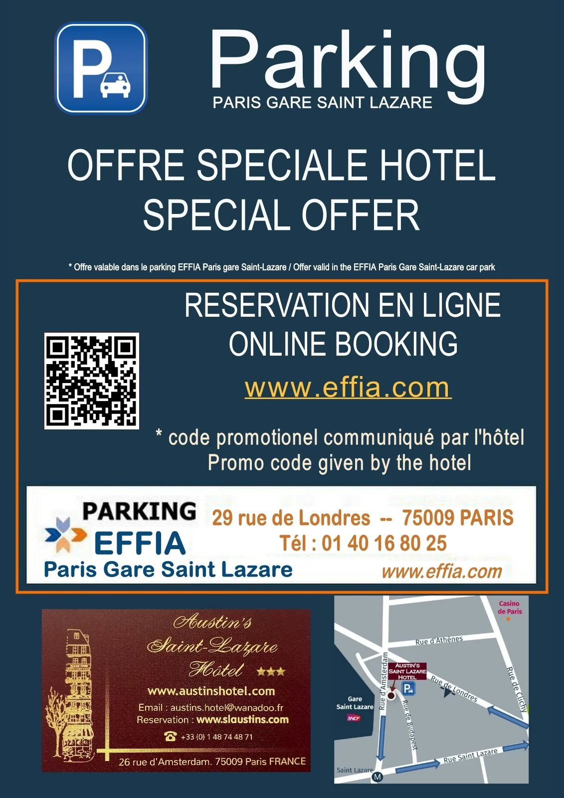 Bonne nouvelle pour les voyageurs en voiture : un parking public couvert et sécurisé se trouve juste en face de l’hôtel (moins de 50 mètres), avec un tarif préférentiel spécialement réservé à nos clients.